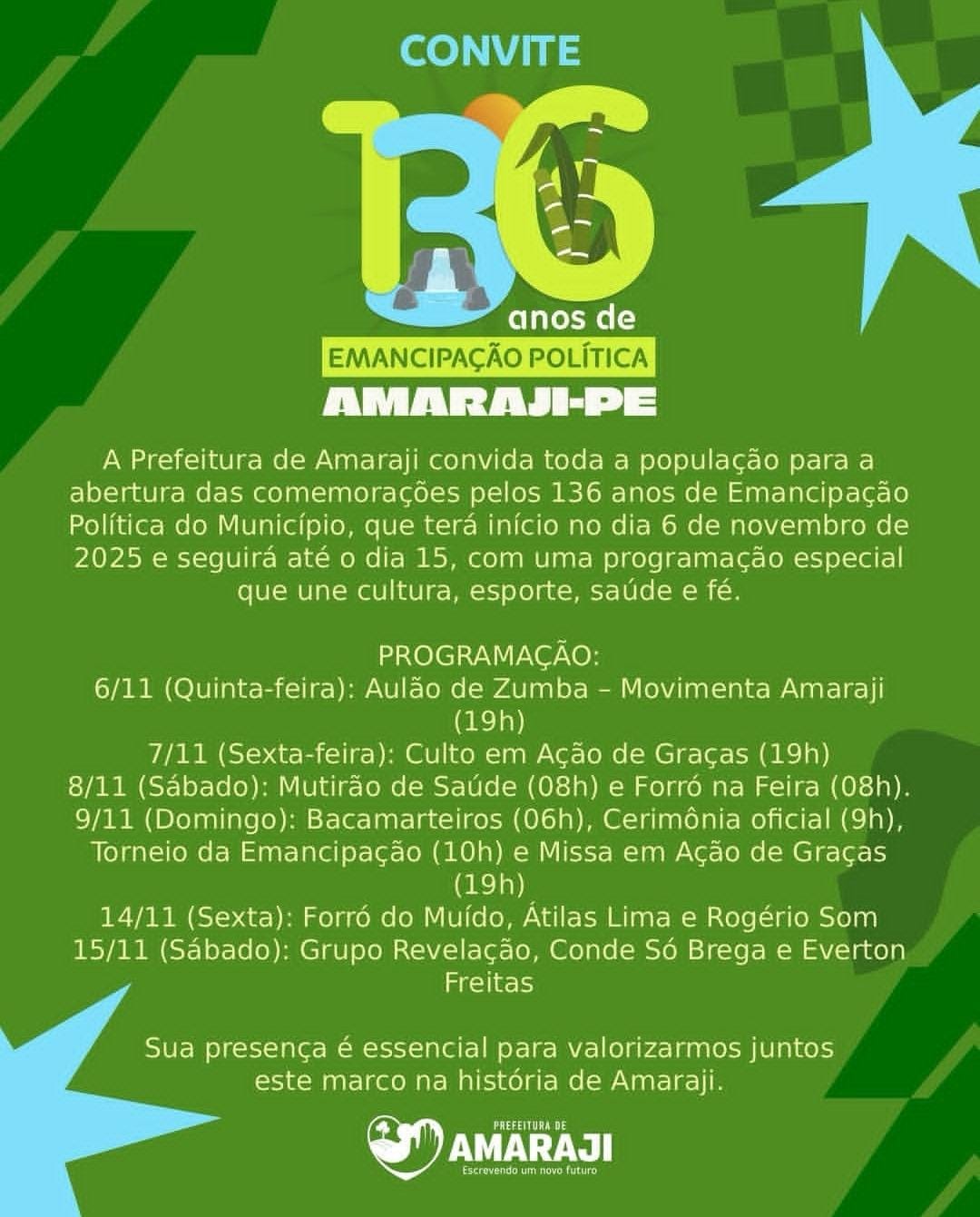 PREFEITURA DE AMARAJI CONVIDA TODOS PARA PARTICIPAR DAS COMEMORAÇÕES DE 136 ANOS DE EMANCIPAÇÃO POLÍTICA DO MUNICÍPIO