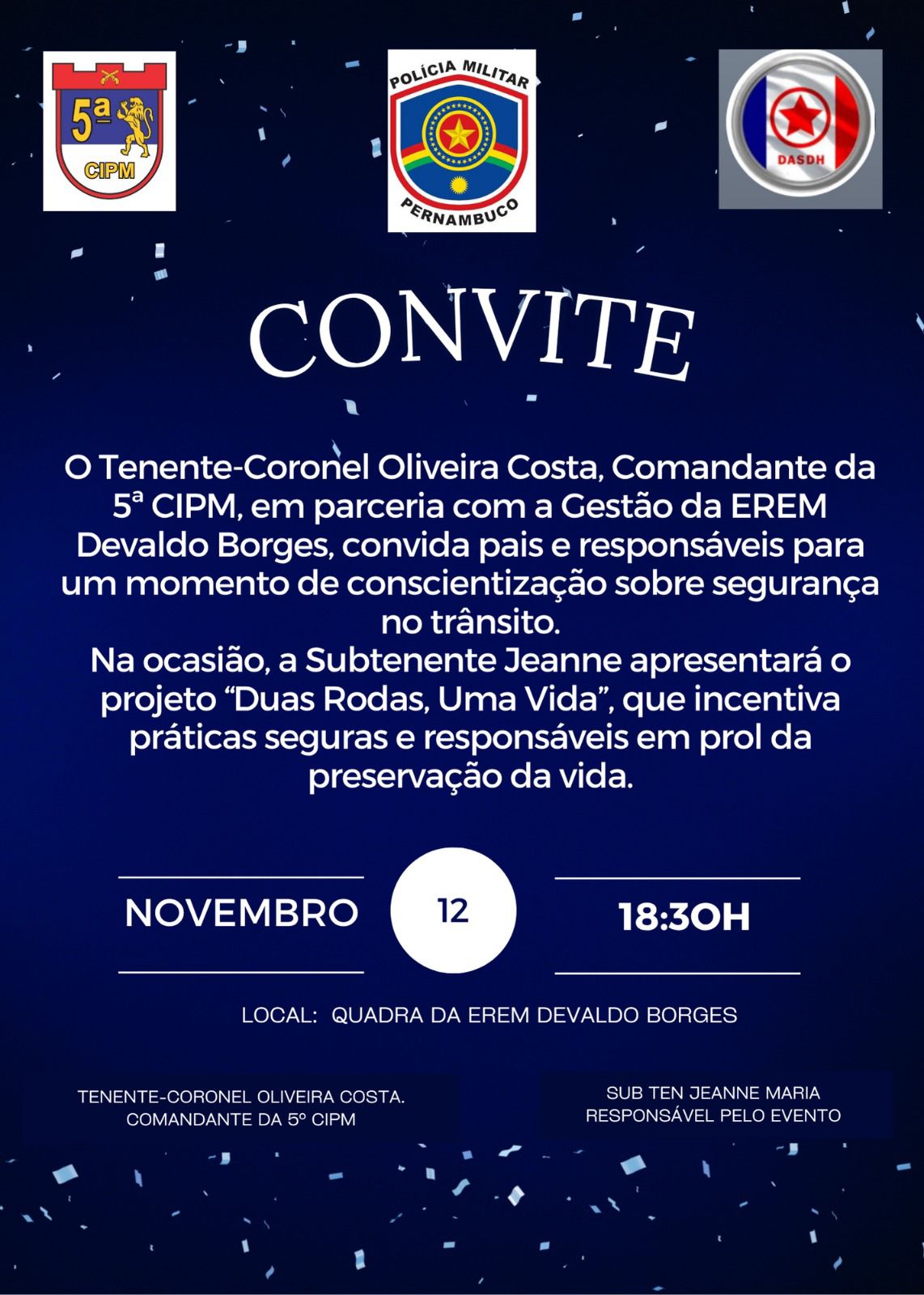 CONVITE DA 5ª CIPM AOS PAIS E RESPONSÁVEIS DO EREM DEVALDO BORGES PARA UM MOMENTO DE CONSCIENTIZAÇÃO SOBRE SEGURANÇA NO TRÂNSITO